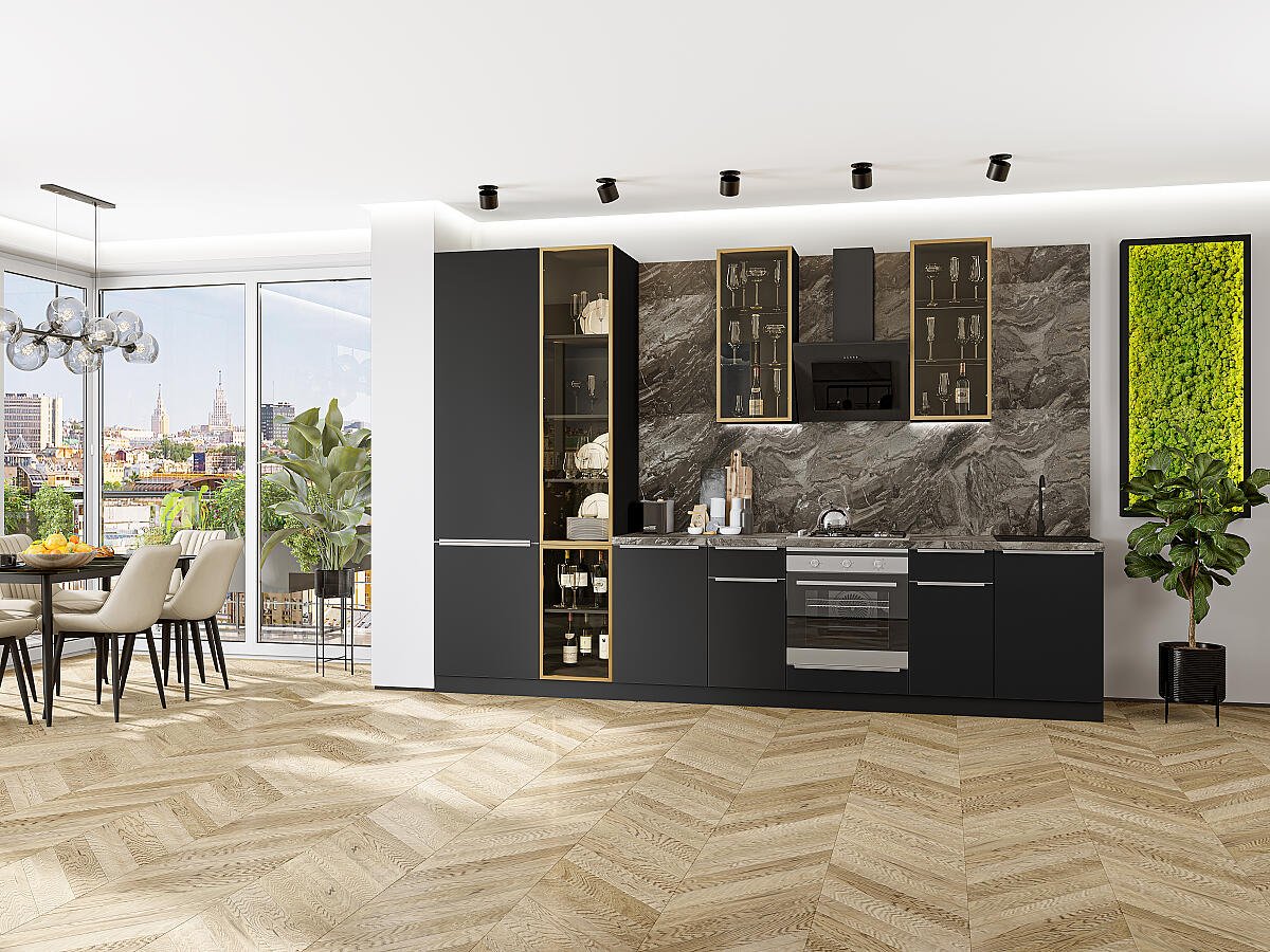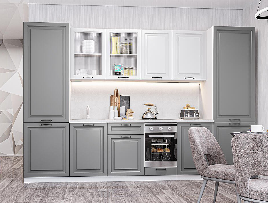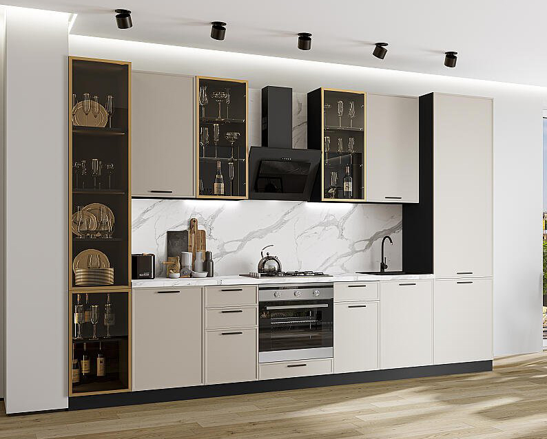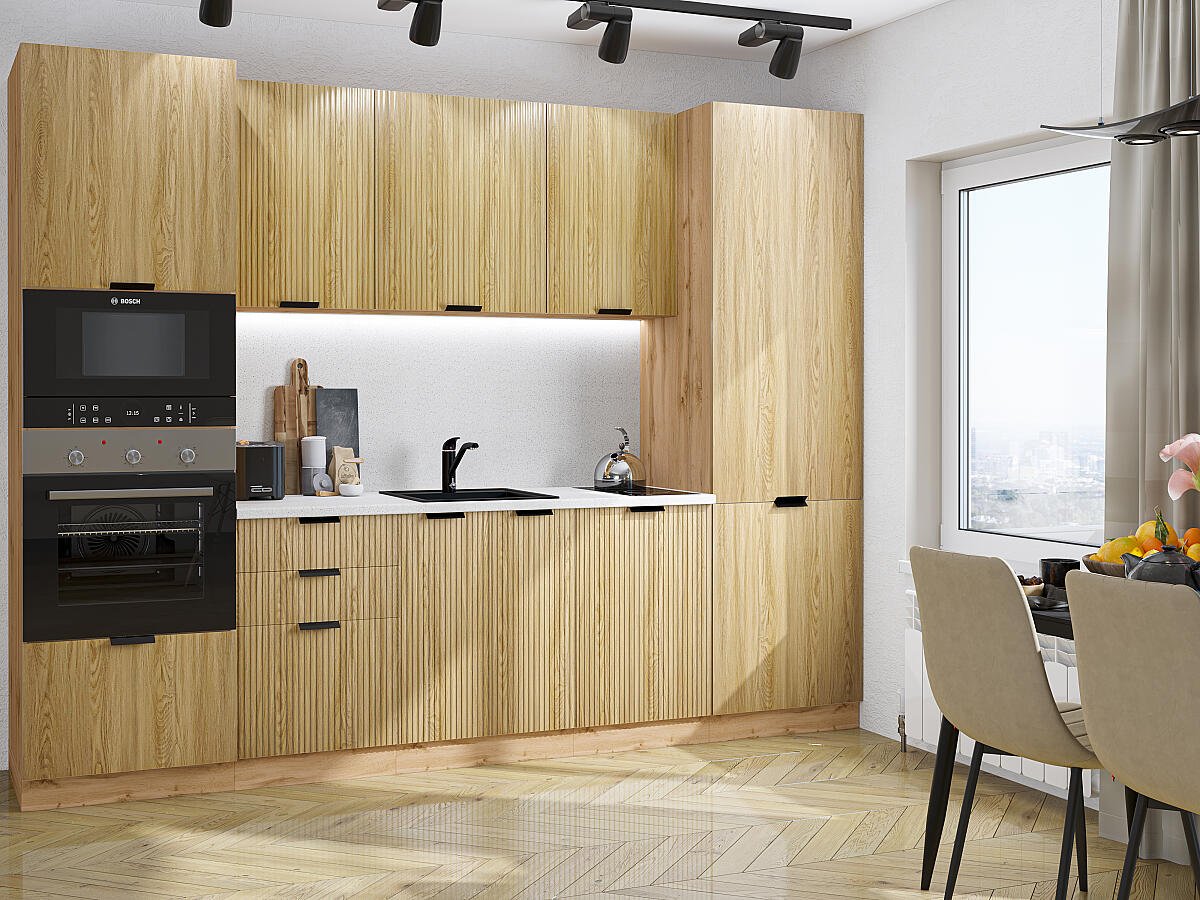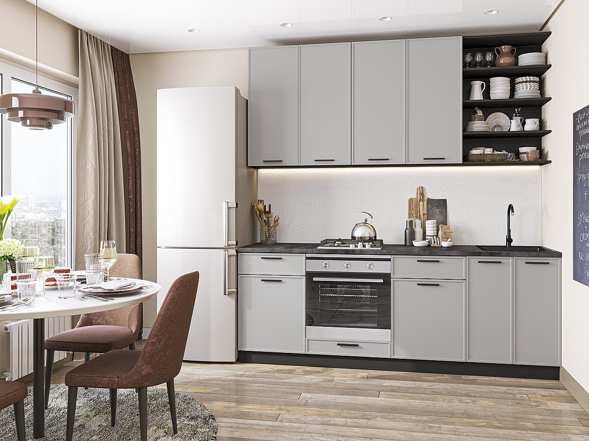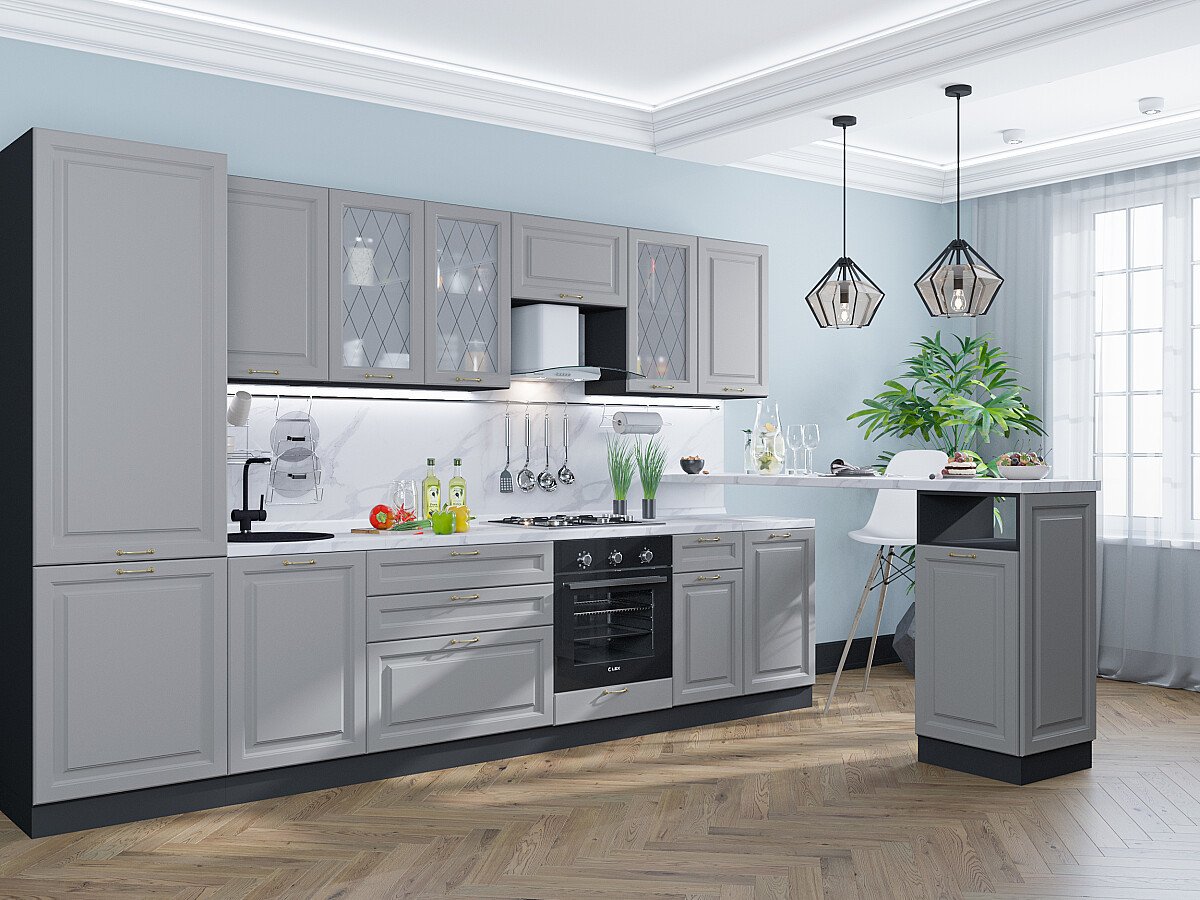 В комплект входят кухонные модули, торцевые фальш панели, фабричная фурнитура, регулируемые ножки, столешница в CPL пластике