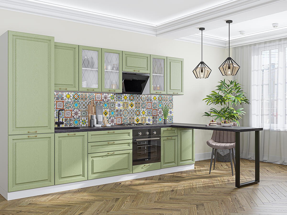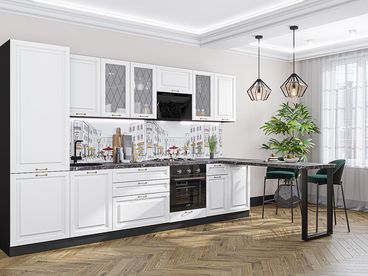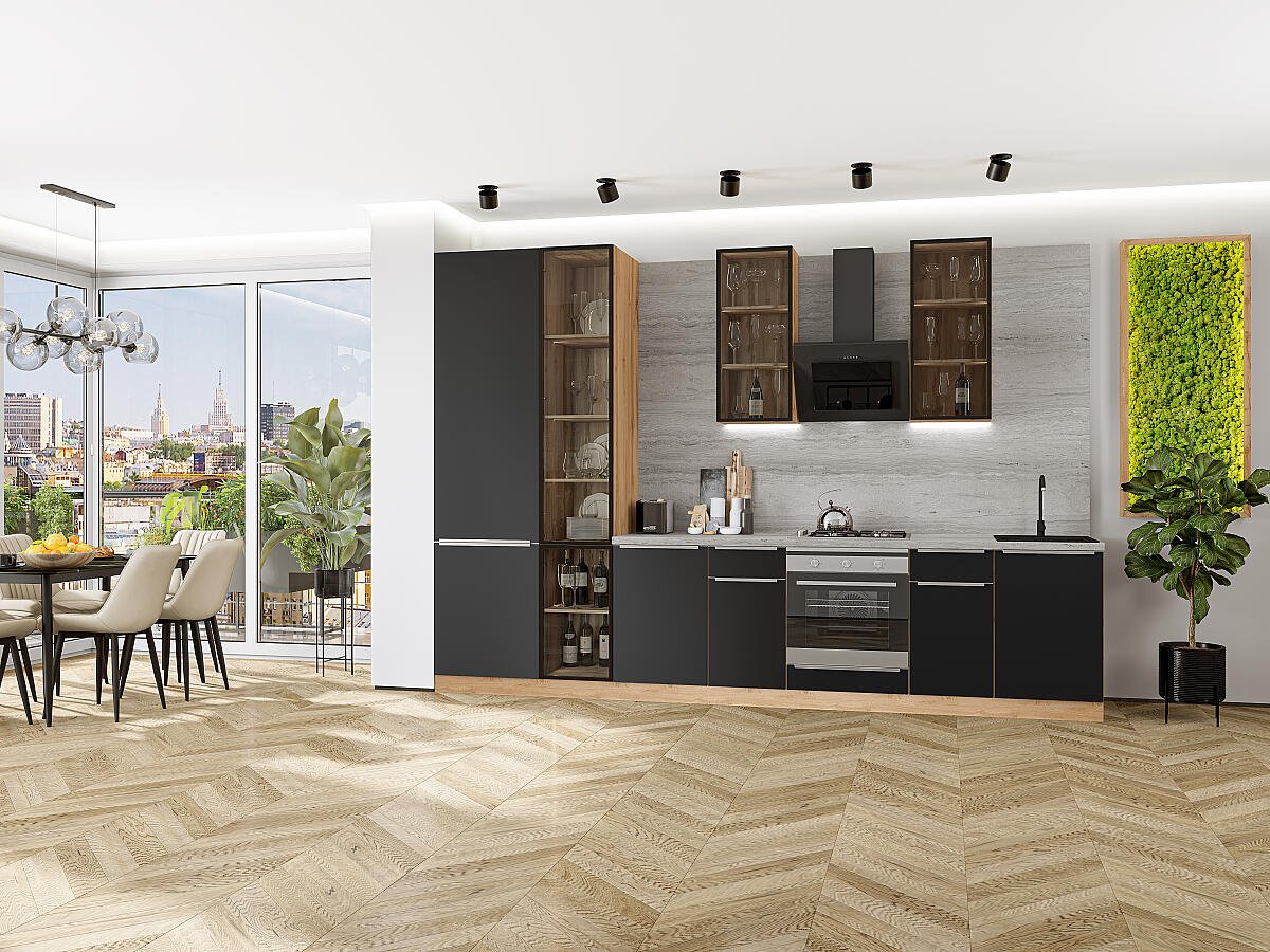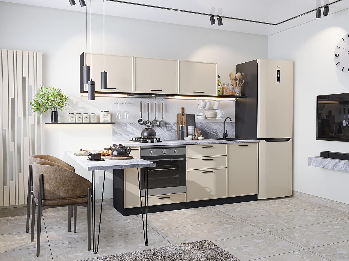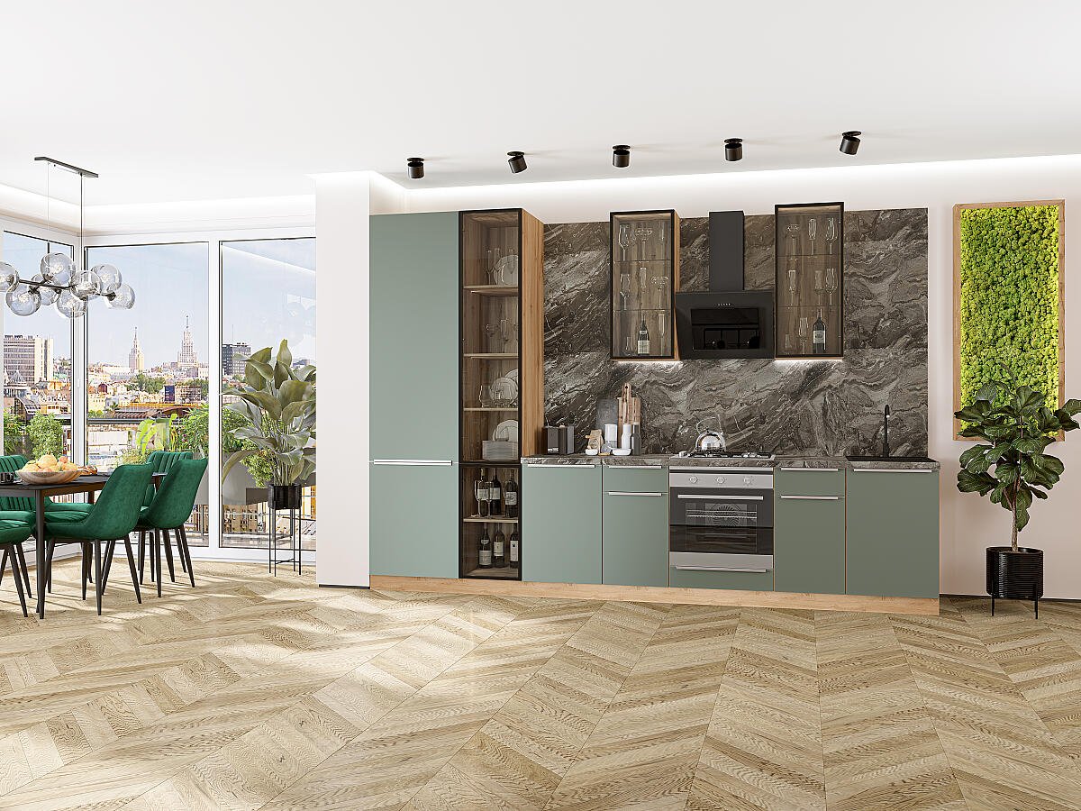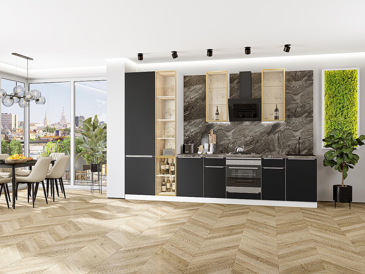В комплект входят кухонные модули, торцевые фальш панели, фабричная фурнитура, регулируемые ножки, столешница в CPL пластике