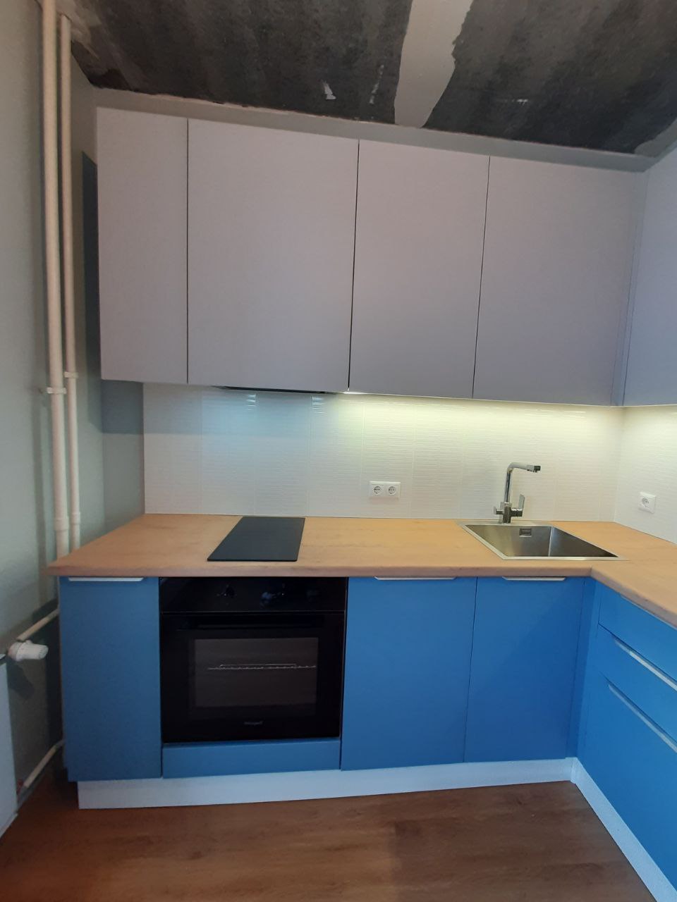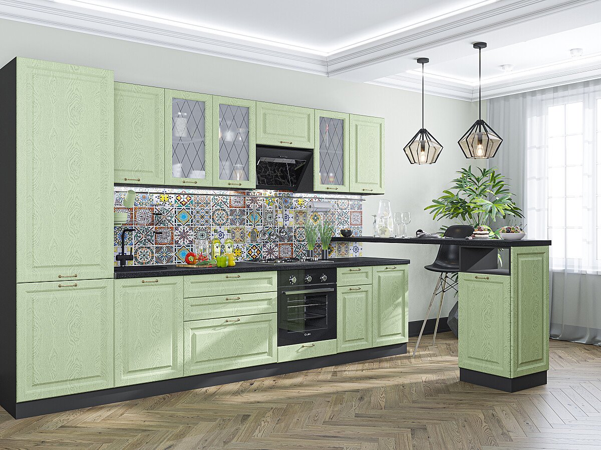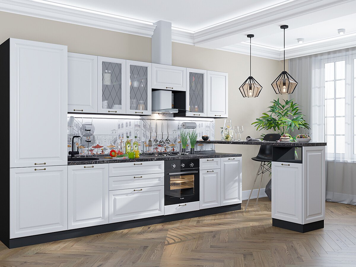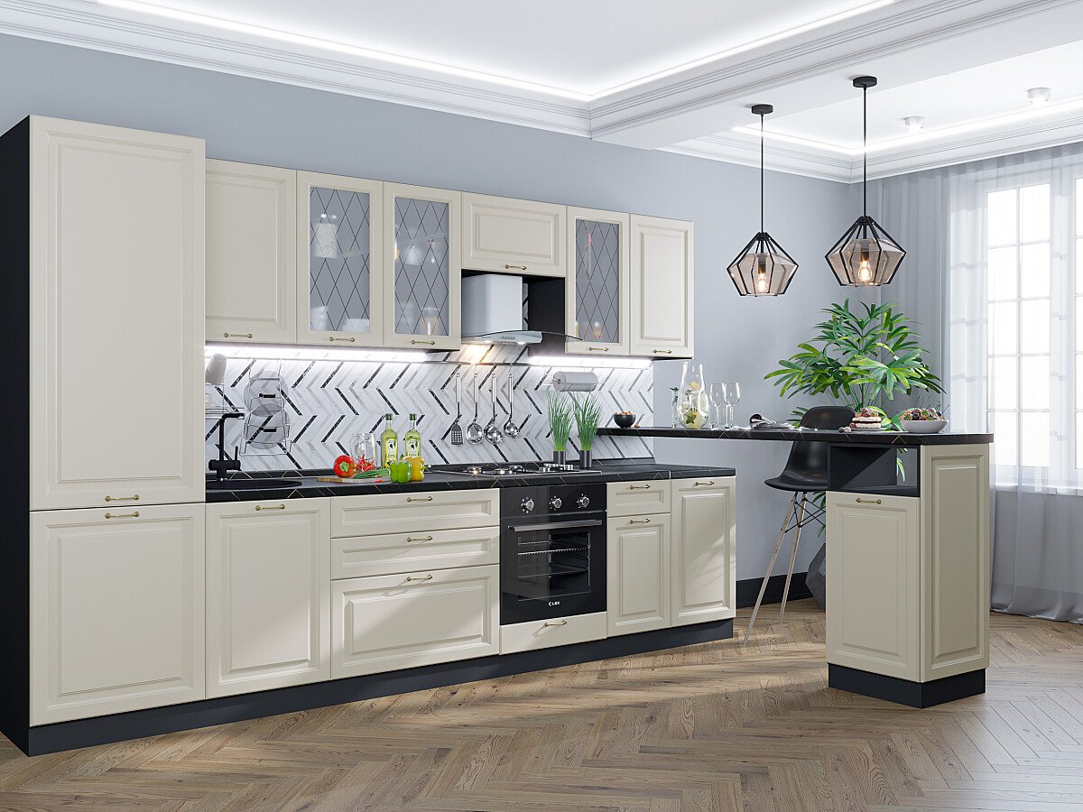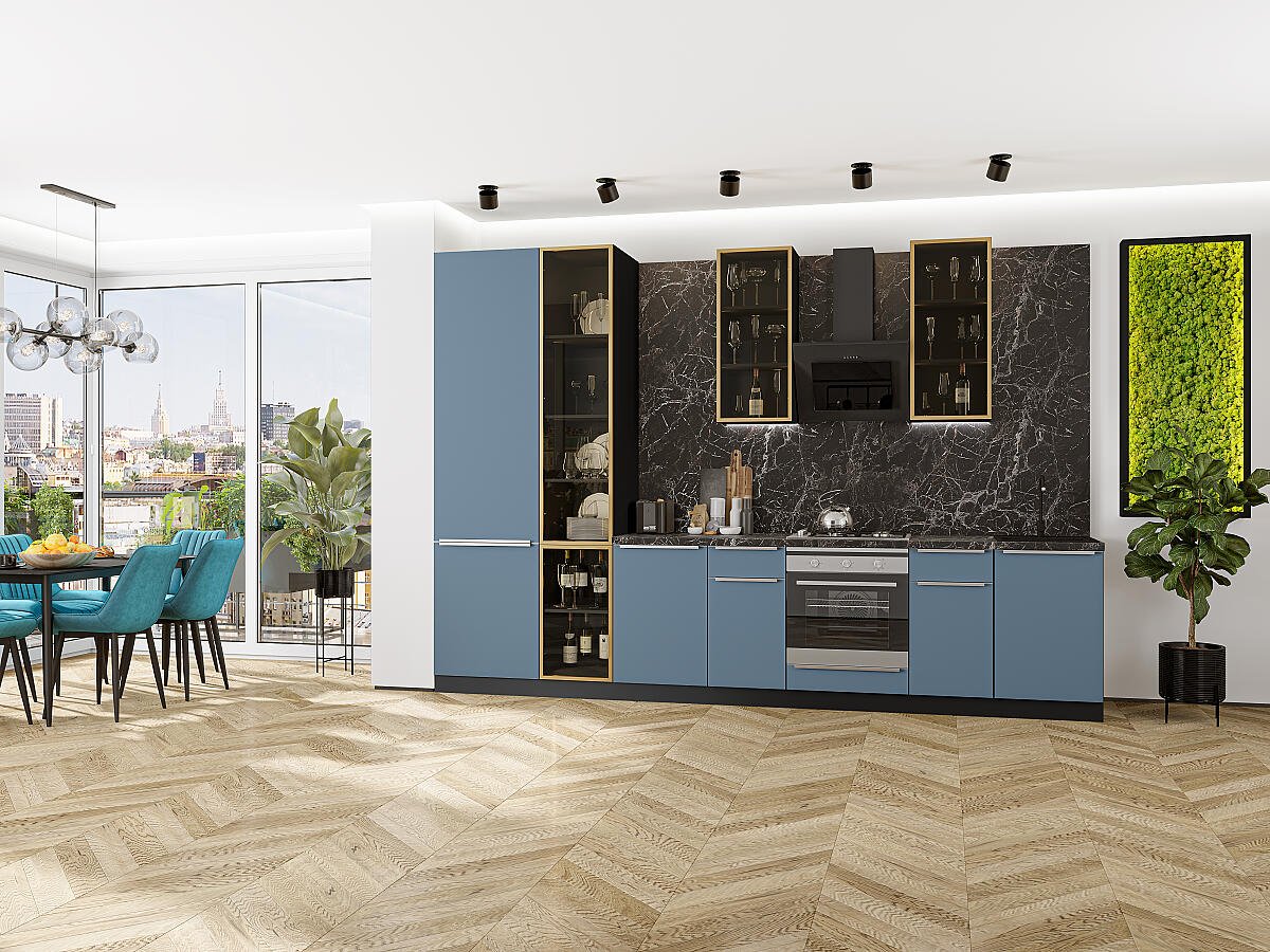 В комплект входят кухонные модули, торцевые фальш панели, фабричная фурнитура, регулируемые ножки, столешница в CPL пластике